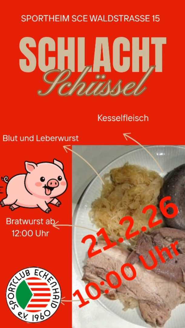 Herzliche Einladung zur Schlachtschüssel im Sportheim des SC Eckenhaid, es gibt ab 10:00 Uhr Kesselfleisch, frische Blut und Leberwürste. Ab 12:00 Uhr servieren wir Bratwürste. Auf euer kommen freut sich der SC Eckenhaid